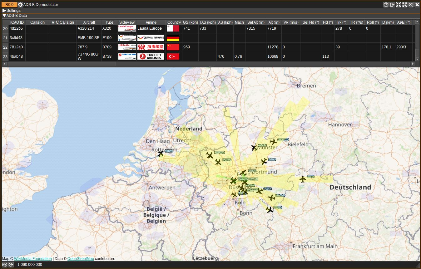 Das Bild zeigt den Empfangsradius der bei 100 - 160 Km Liegt, der sebstgebauten 3 Dipol Antenne, das ist die Antenne mit den Kreisen im Strahler, und den 4 Radialen.