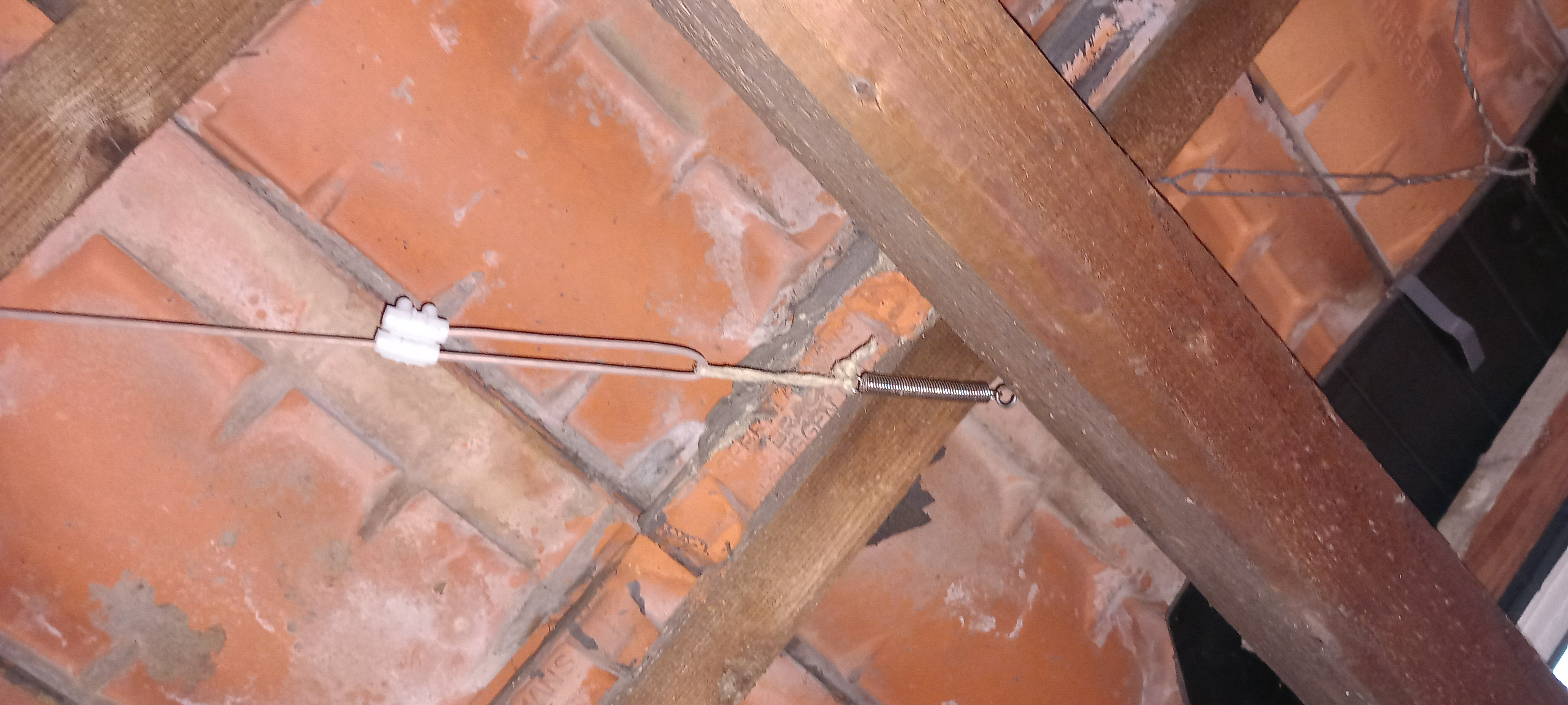 Rechts und Links montierte ich einen hacken in dem Balken und setzte da eine Feder auf, an der Feder machte ich eine Schlaufe aus einer Kordel und daran machte ich die Antenne mit der Lüsterklemme.